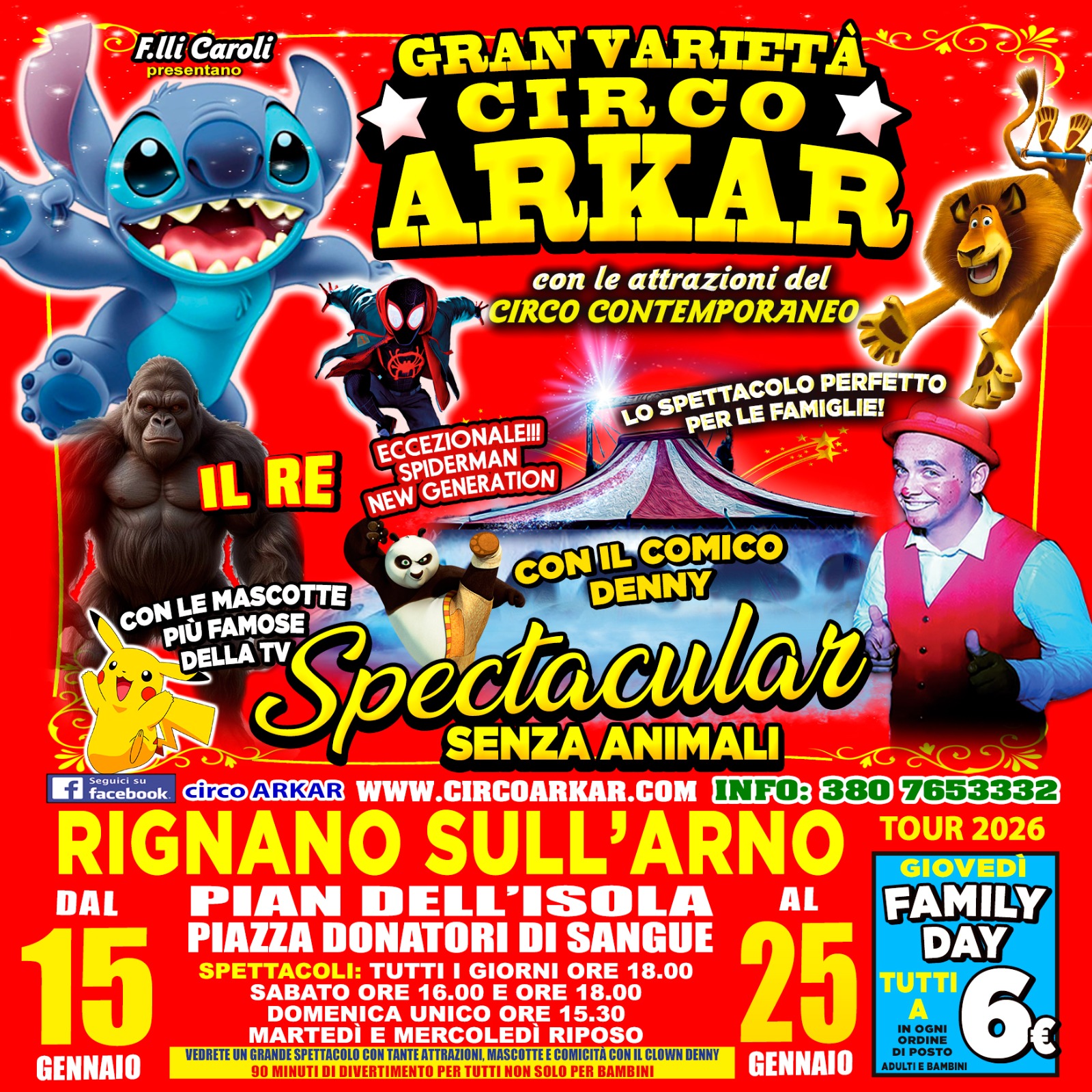 Circo Arkar è un circo unico nel suo genere, specializzato in spettacoli circensi con le mascotte più amate della TV. La nostra missione è di portare allegria e divertimento senza l'uso di animali, offrendo uno spettacolo adatto a tutta la famiglia. Un'esperienza indimenticabile che unisce arte, acrobazie e personaggi amati dai bambini.